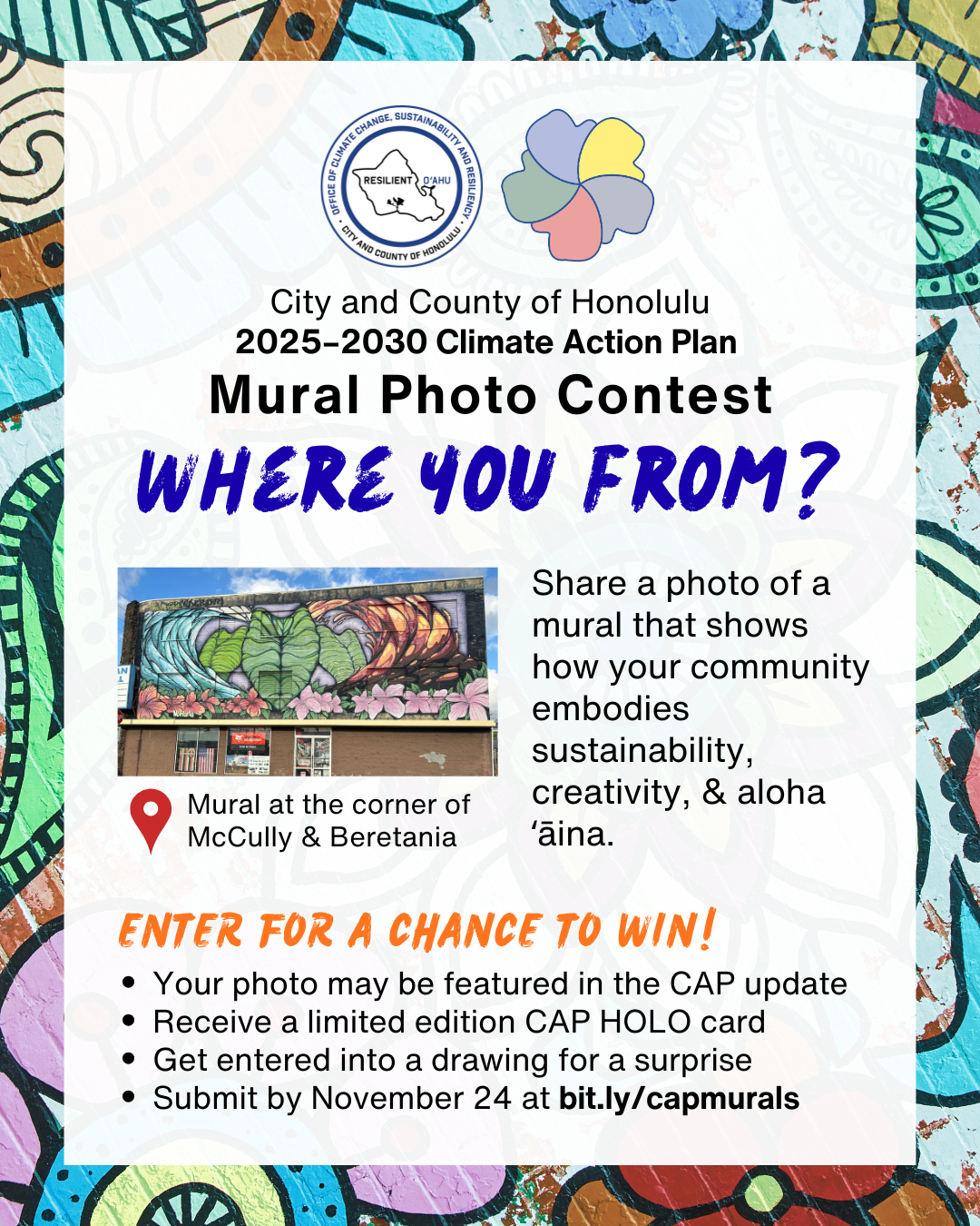 Selected photos may be featured in the City’s 2025–2030 CAP or on related materials celebrating local leadership. All eligible participants will receive a limited edition CAP HOLO card loaded with $9, and will be entered into a drawing. From the drawing, one (1) lucky participant will receive a surprise curated from local non-profit organizations and small Native Hawaiian-owned Oʻahu businesses whose work supports the same sustainability and community resilience goals featured in the CAP. Winner and selected photos will be announced in December 2025.