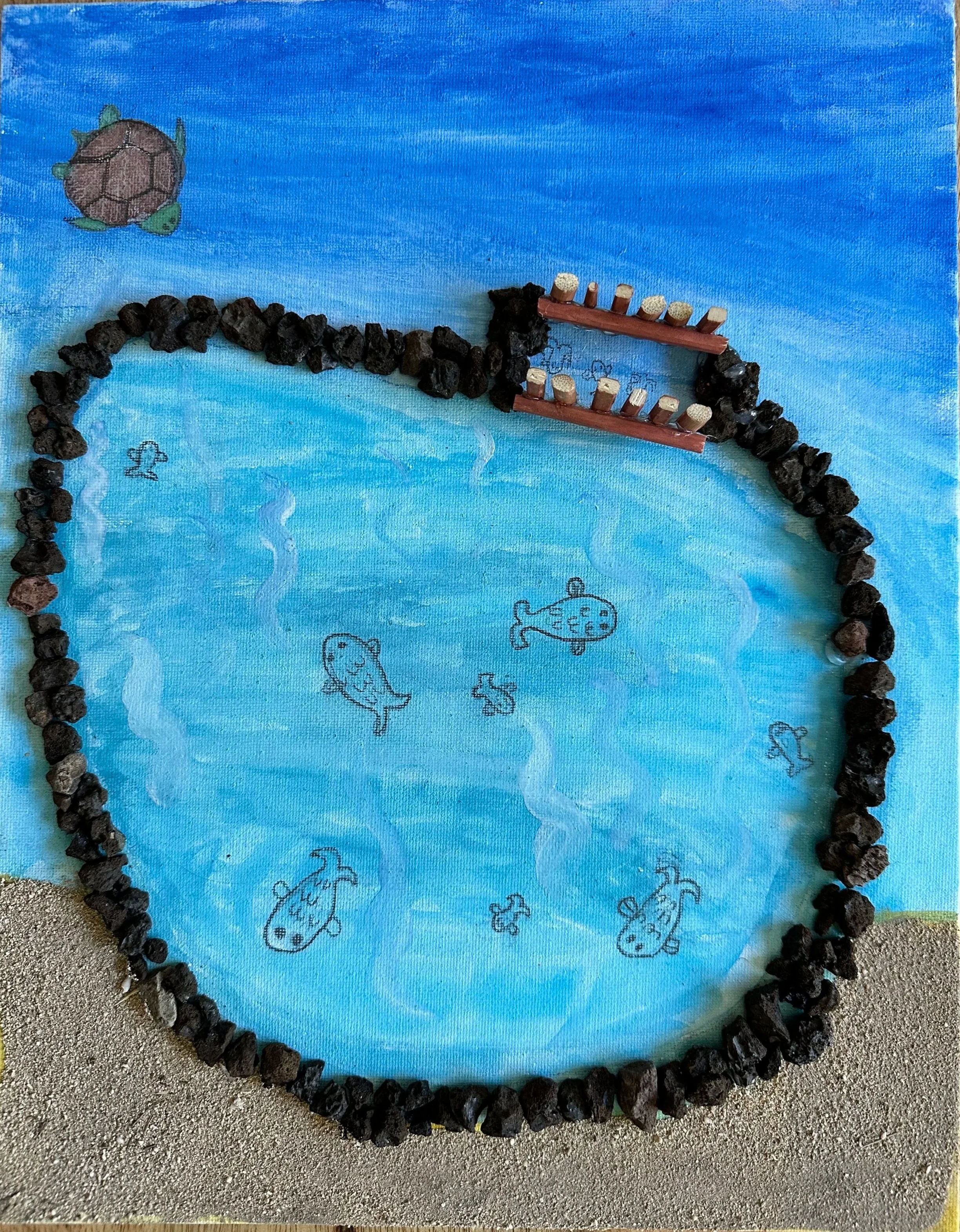 Artist Statement: There is a loko ‘ia and in the fishpond there are fish. People go to the loko ‘ia to catch fish. I titled this “A School” because I’m teaching people where there are resources and how their actions affect the Uka and the Kai. Also, a group of fish is called a school.